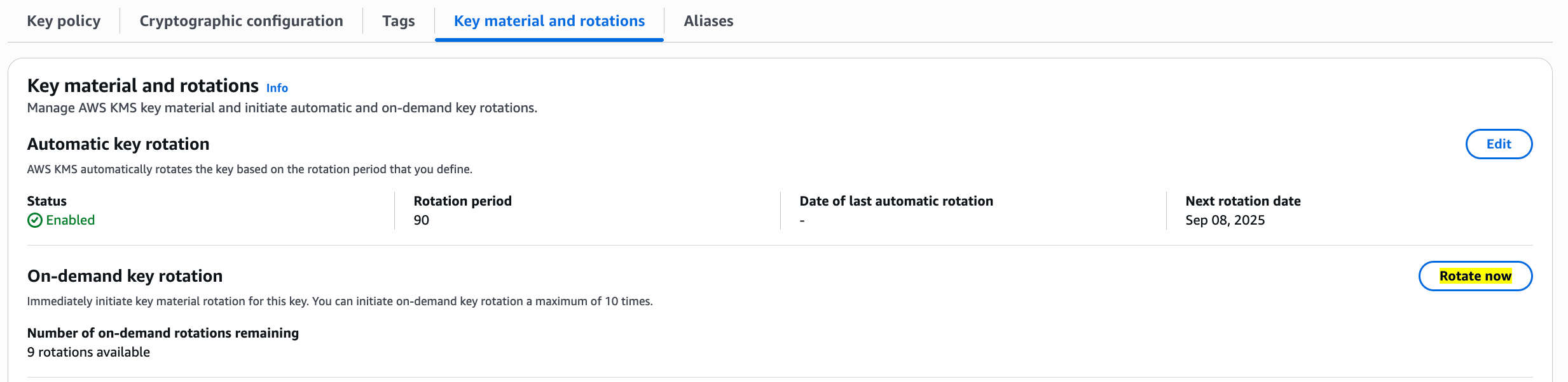 AWS Key Management Service (KMS) now supports on-demand rotation of symmetric encryption keys with imported key material (BYOK), enabling periodic key rotation, without changing the key identifier. Link. Well explained in THIS blog. For example, here is my on-demand rotation option and remaining rotation counts: