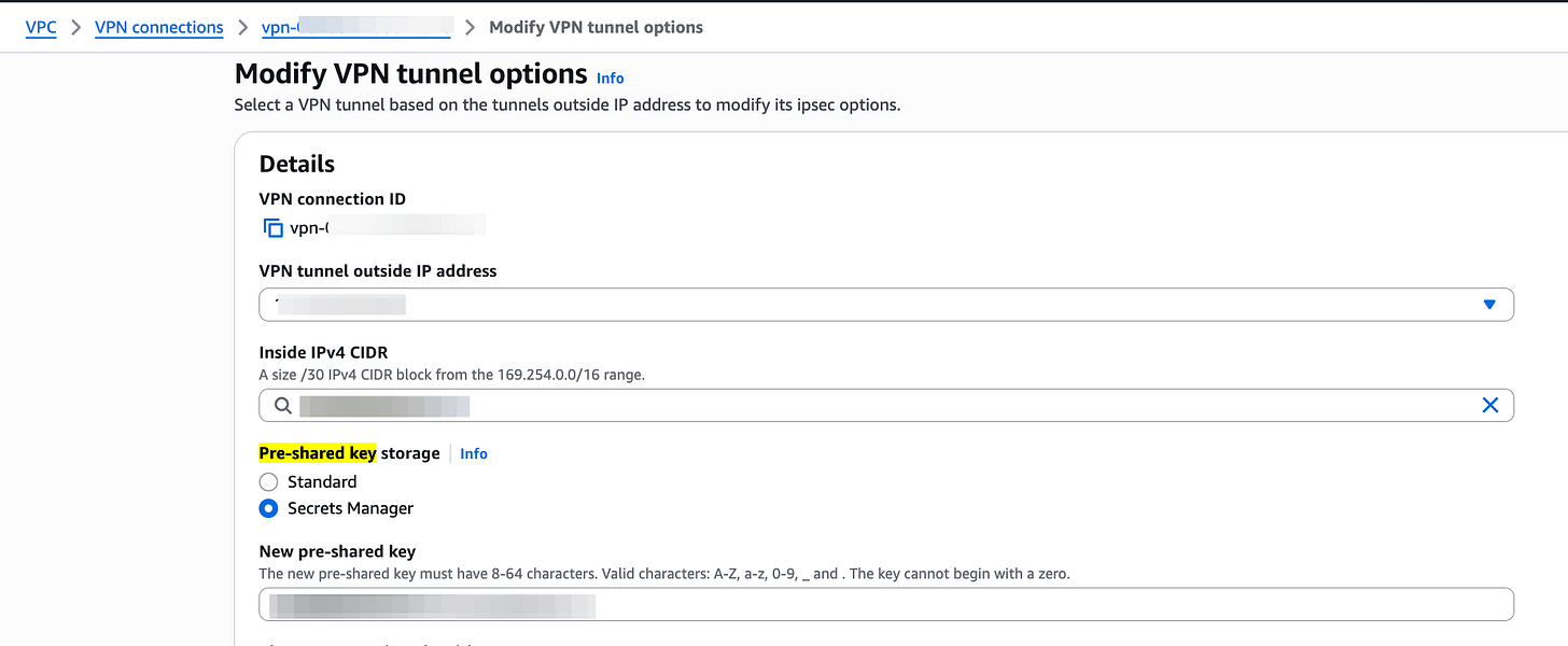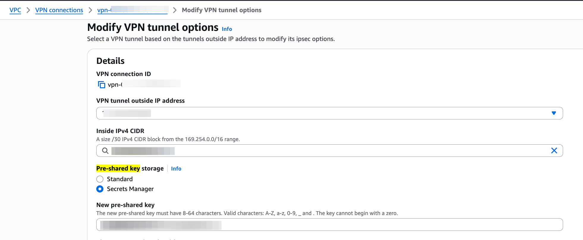 AWS Site-to-Site VPN is introducing three new features: a) Secrets Manager integration hides pre-shared keys in API responses. b) A new API tracks VPN encryption details and c) A "recommended" config option promotes best-practice security settings. Link. CLI references HERE and here are my configs: