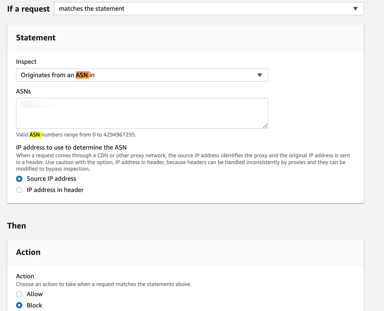AWS WAF has added support for matching incoming requests against Autonomous System Numbers (ASNs), allowing you to mitigate risks from malicious actors Comply with regulatory requirements Optimize web application performance and availability. The new ASN Match Statement integrates with existing WAF rules. Link. For example, here’s my config: